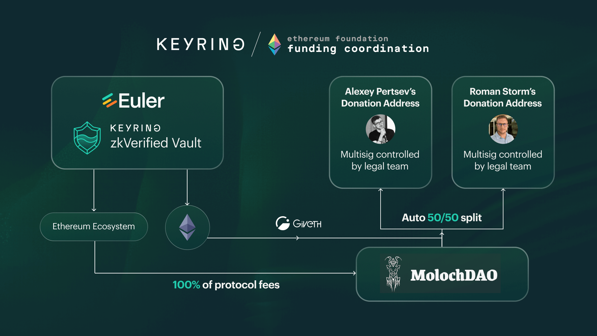 Keyring, with strategic support from the Ethereum Foundation’s Funding Coordination team, will donate all early vault fees to support Roman Storm’s and Alexey Pertsev’s legal battles while advancing zkVerified DeFi compliance